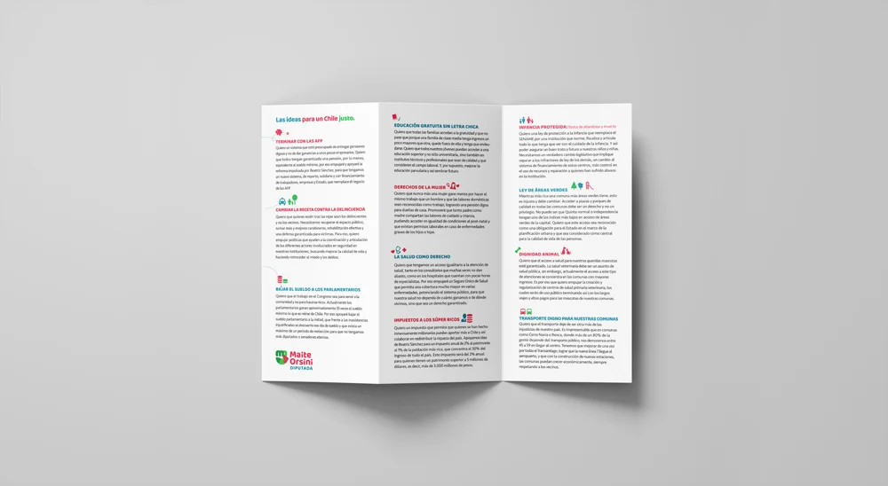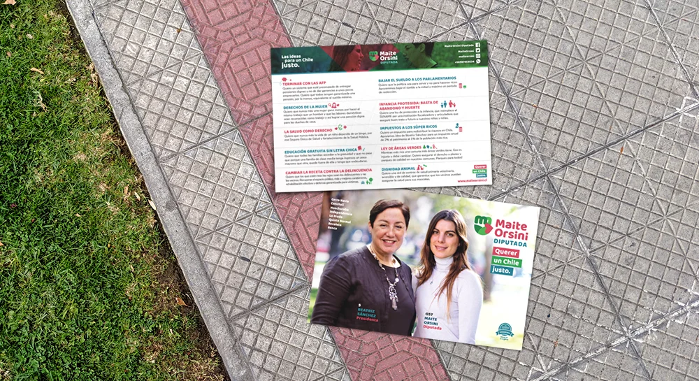 Durante los períodos de campaña en 2017, apoyamos en la comunicación y diseño a algunos candidatos del Frente Amplio, por la búsqueda de nuevas ideas en la política. Soledad Alamos (RD) por el distrito 11, Noemí Martínez por Consejera Regional y Maite Orsini quien resultó electa diputada por el distrito 9 con el 6,48%, equivalente a 21.631 votos.