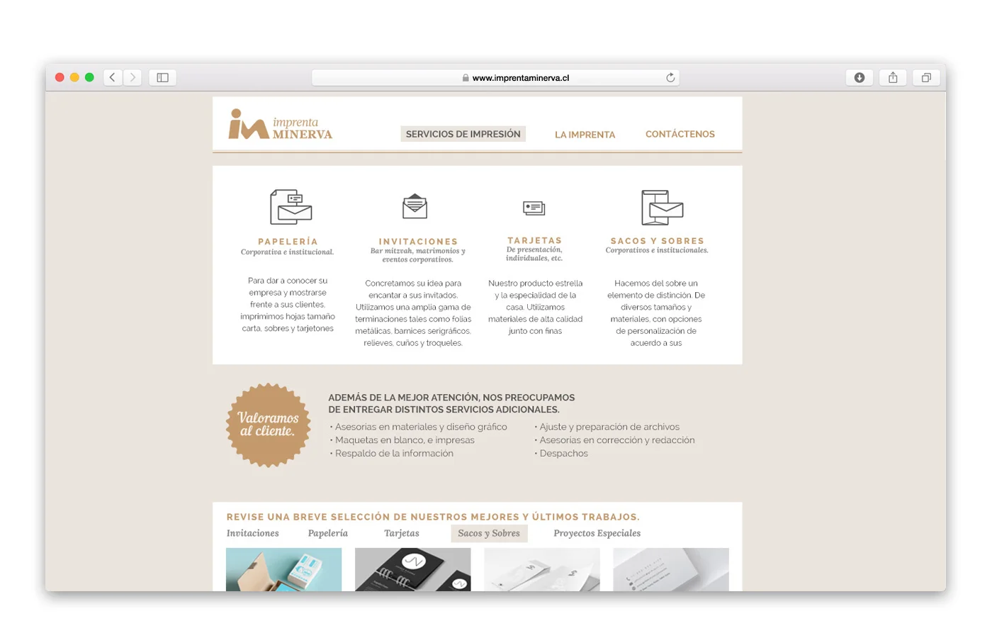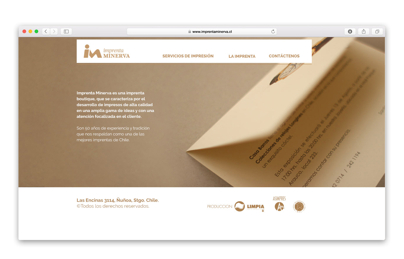 Minerva es una imprenta boutique que tiene como principal foco la calidad y el buen trabajo de las tintas y el papel. Nos encargaron el diseño de su página web con el fin de mostrar sus mejores trabajos y explicar cuales son sus atributos.